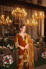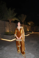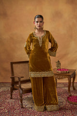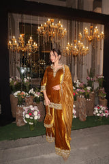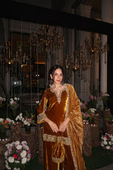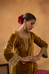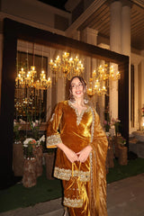 The Aurelia is a regal three-piece suit that captures the richness of traditional heritage wear. Moving away from fleeting trends, this ensemble embraces the opulent warmth of sumptuous Viscose Velvet in a deep, elegant Mustard-Gold hue. The straight-cut Kurti serves as a canvas for intricate, heavy Gold Zari and Dori work, which frames the neckline and elegantly traces the lower hem and sleeve cuffs. This sophisticated suit provides a comfortable yet opulent fit, making it the perfect choice for Mehendi ceremonies, wedding guests, or any grand festive occasion where a vibrant, rich look is desired.