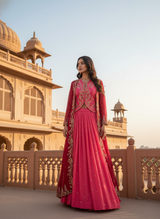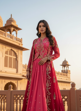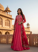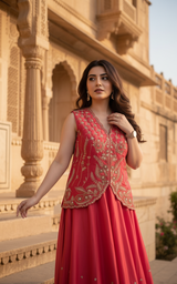 Radiate regal elegance with The Aurora, a masterful composition of modern fusion and traditional artistry. Crafted for the woman who commands attention, this three-piece ensemble features the lustrous sheen of Pure Simar fabric paired with the ethereal flow of Georgette. The interplay of heavy embroidery and structured silhouettes makes this set a definitive choice for sangeets, receptions, and grand festive soirées.