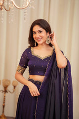 Make waves with The Lehar. This contemporary ensemble is crafted from trending Diamond Crush Silk, a fabric known for its unique textured sheen and fluid drape. The highlight of this outfit is the massive 4-meter flair finishing with a playful, "flairy" ruffle border that adds dramatic movement to every step. With intricate dori and sequin detailing at the waist and blouse, this set is the perfect blend of modern minimalism and festive sparkle—ideal for bridesmaids and cocktail nights.